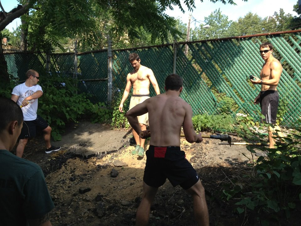 If you take a peek outside you’ll notice the aforementioned hole. Throughout the next week or so there will be loads of work going on back there so “Pardon the appearance”. Once completed, we’ll have a nice CrossFitter’s Cave; full of Squat Racks, Grills and lawn chairs. Kinda like our own hang out area. Stay tuned for updated pictures!