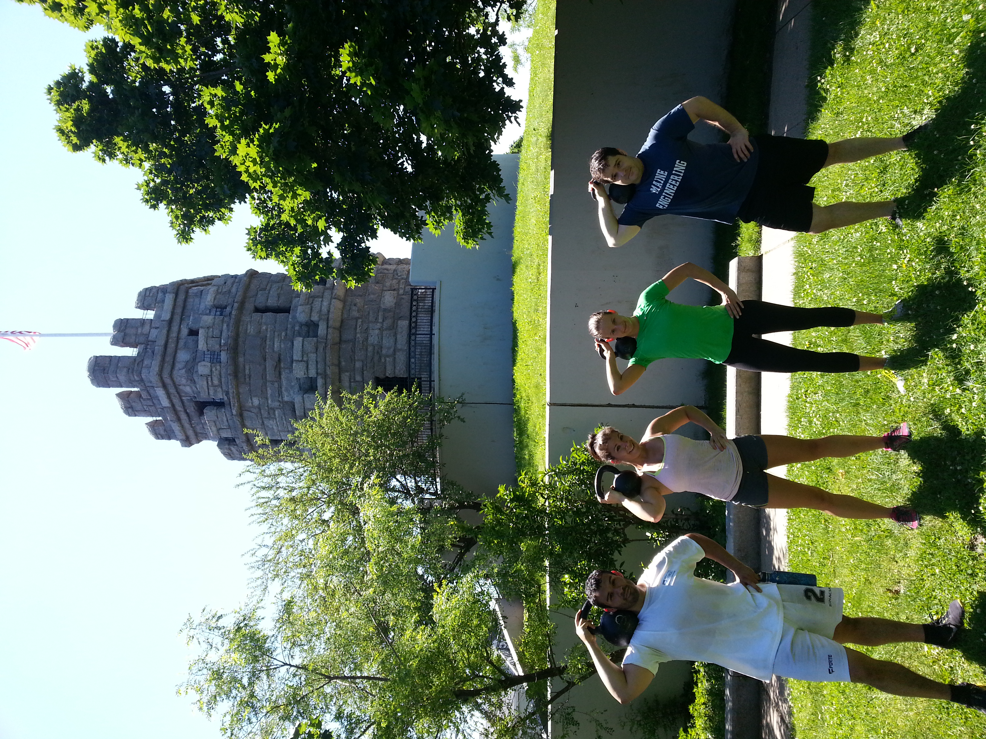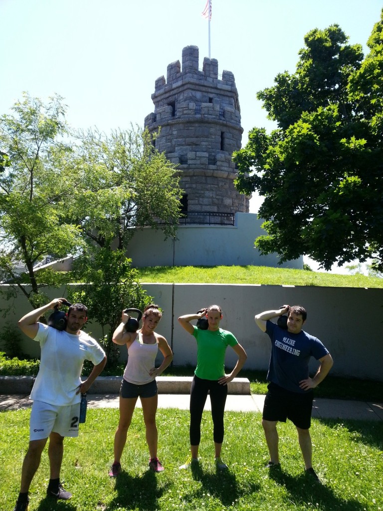 As you can see, last Saturday was gorgeous. I know a lot of you are traveling – tis the vacation season – but for those of you who are in town the Saturday WOD is a great way to get out of the box and have some fun. Last Saturday I took this good-lookin bunch of fitsters up Prospect Hill for some stair sprints, wall jumps, and KB fun.