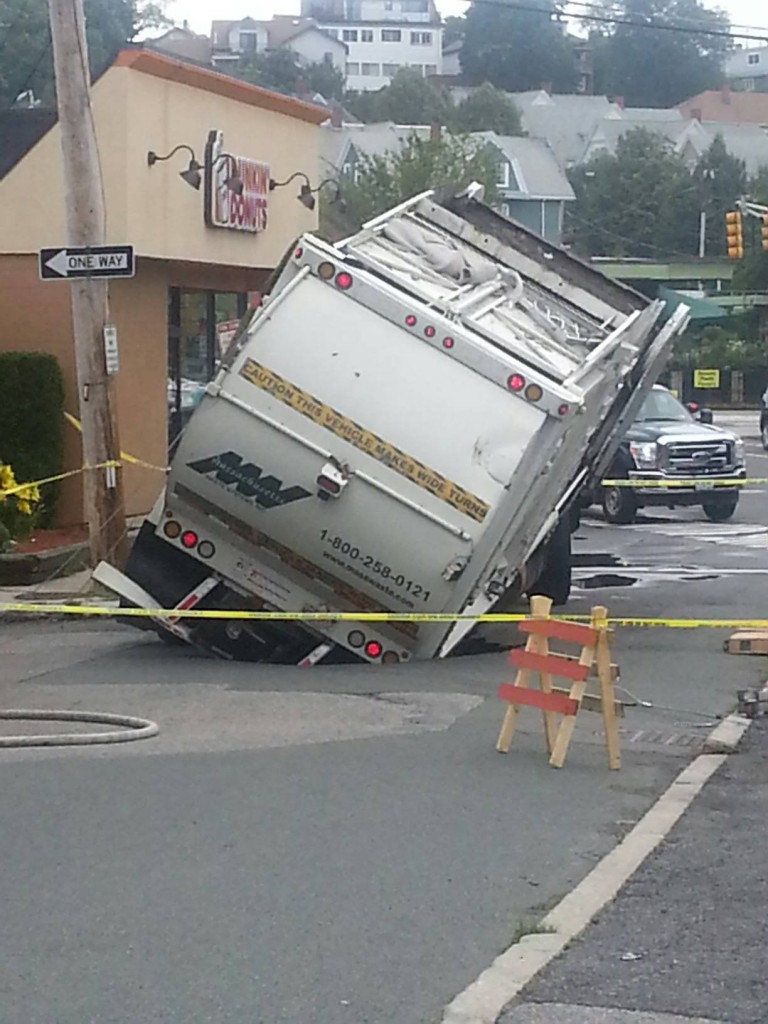 So, this is the Newton Street entrance to our parking lot. It’s a giant trash truck that opened up – and fell into – a giant sinkhole. The hole is safe – contrary to early reports, there are no water main or gas lines endangered there.